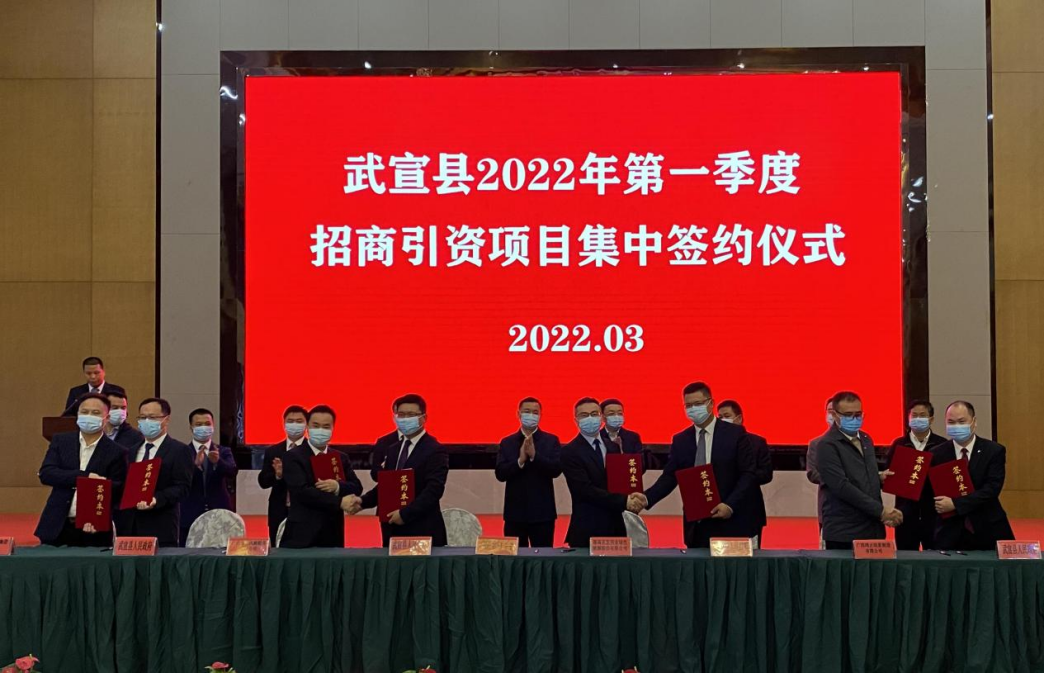 近日,水發興業能源集團黨委委員、副總裁周青一行應邀參加廣西省來賓市武宣縣2022年第一季度招商引資項目集中簽約儀式,與武宣縣簽訂《廣西武宣縣整縣分布式光伏項目合作協議》。簽約儀式由武宣縣委副書記陳禮鋒主持,來賓市市長廖和明、武宣縣委書記楊世爵、縣長陳前平出席儀式。