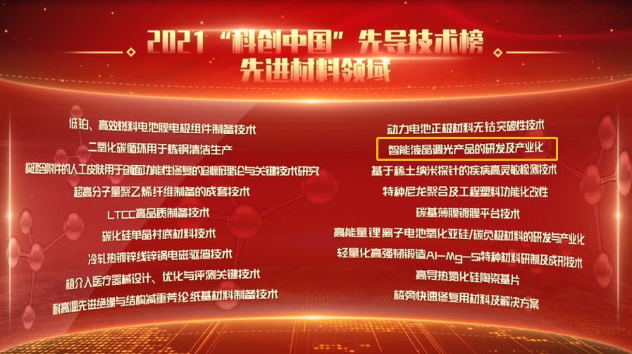 近日,2021年“科創中國”先導技術榜單結果公示,共遴選出100項具有開創、突破意義,可轉移、轉化、交易的先導技術成果。由中國興業新材料控股有限公司選送的“智能液晶調光產品的研發及產業化”榮登榜單。